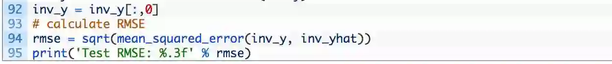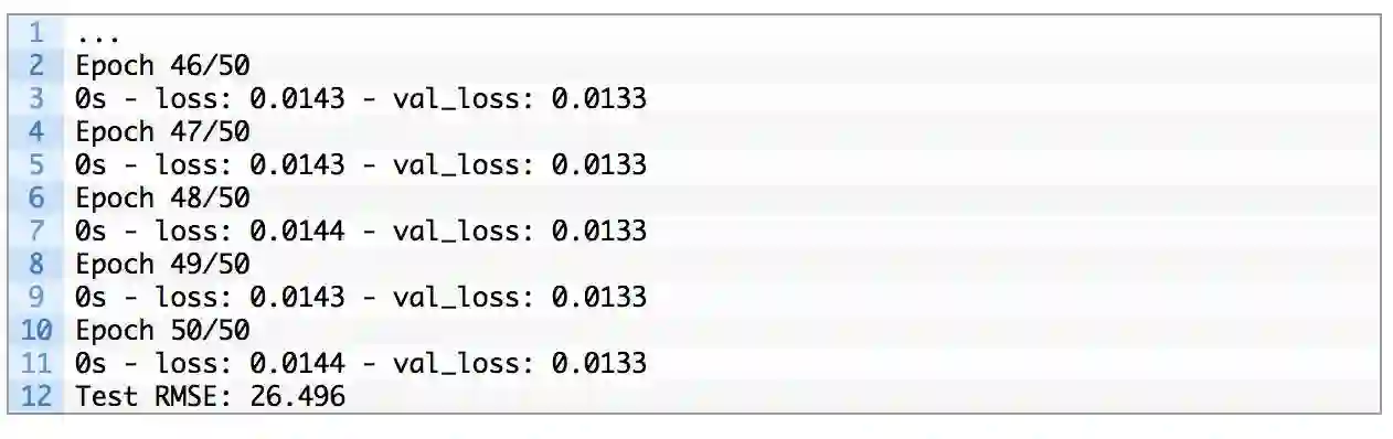 在每个训练 epoch 结束时输出训练和测试的损失。在运行结束后,输出该模型对测试数据集的最终 RMSE。我们可以看到,该模型取得了不错的 RMSE——3.836,这显著低于用持久模型(persistence model)得到的 RMSE(30)。