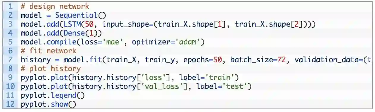 我们将在第一个隐藏层中定义具有 50 个神经元的 LSTM,在输出层中定义 1 个用于预测污染的神经元。输入数据维度将是 1 个具有 8 个特征的时间步长。