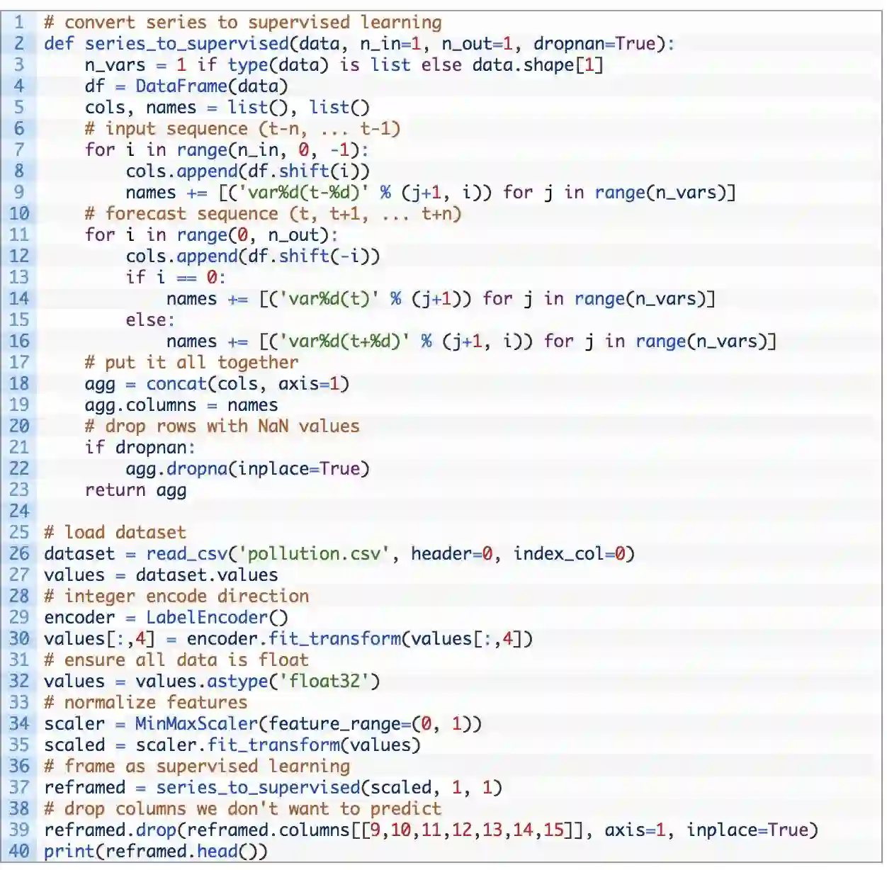 我们可以使用之前博客中编写的 series_to_supervised()函数来转换数据集:
