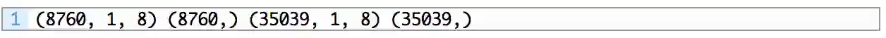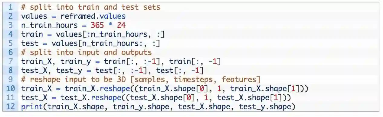 下面的示例将数据集分成训练集和测试集,然后将训练集和测试集分别分成输入和输出变量。最后,将输入(X)重构为 LSTM 预期的 3D 格式,即 [样本,时间步,特征]。