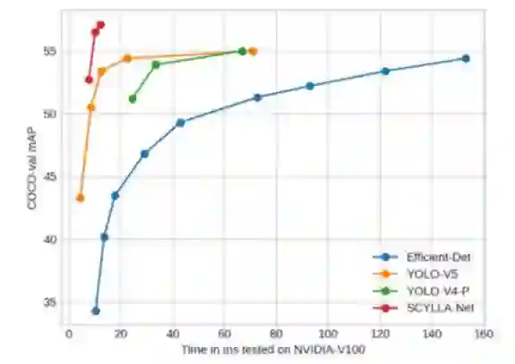 更大的模型可以达到 57.1% mAP@0.5:0.95(12ms 包括预处理、推理和后处理)和 74.3% mAP@0.5,而其他架构如 Efficient-Det-d7x、YOLO-V4 和 YOLO-V5 可以达到mAP@0.5:0.95分别为 54.4% (153ms)、47.1% (26.3ms) 和 50.4%(使用 fp16 进行 6.1ms)。