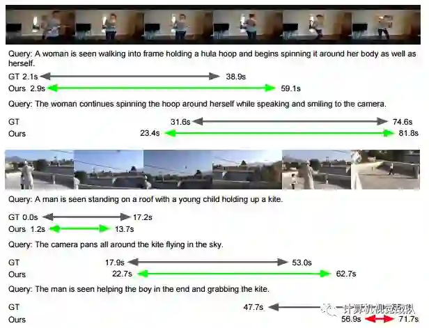 示例检索的定性可视化结果,在Charades-STA数据集(图3)和ActivitynetCaptions数据集(图4)上。与查询相对应的GT剪辑用黑色箭头标记。正确的预测(预测片段的时间与GT的IOU超过0.5)标记为绿色,不正确的预测标记为红色。开始和结束时间以秒为单位。