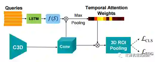 上图就显示了查询引导的SPN的结构。原始SPN显示在底部,通过汇集嵌入LSTM语句的隐藏状态(在下面进行描述),将每个查询语句S嵌入到特征向量f(S)中。然后,对于每个时间位置,通过获取视频特征和f(S)的内积,并通过tanh激活来计算注意力权重。在每个时间位置上的注意力权重与所有信道上的相应视频特征相乘。当有多个查询时,最大限度地将权重集中在查询维度上。
