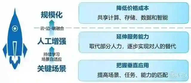 类似互联网的三级火箭发展模式,第一阶段——关键场景, 把握垂直应用,提高场景、任务、能力的匹配,提高机器人在关键应用场景的能力,扩大用户基础;第二阶段——人工增强,通过加入持续学习和场景自适应的能力,延伸服务能力,取代部分人力,逐步实现对人的替代,让机器人的能力满足用户预期; 第三阶段——规模化, 通过云–边–端融合的机器人系统和架构,让机器人达到数百万千万级水平,从而降低价格成本,实现大规模商用。