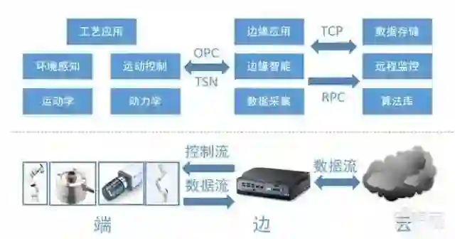 边缘智能 。 边缘智能部署在边缘计算设备上。与端设备,采用的 TSN 硬件协议与 OPC应用协议,最大限度保证了 IT 与 OT 的通信实时性与效率。与云设备,则是采用了 TCP 传输数据与 RPC 进行远程调用,保证了数据传输的安全稳定性,降低云端与边端之间的通信开发难度,提高系统稳定性与扩展性。