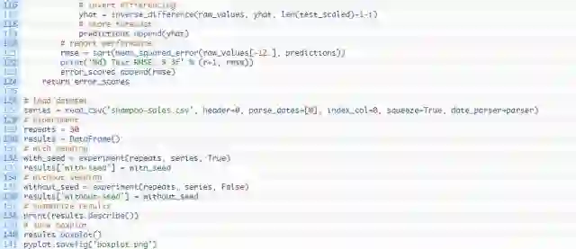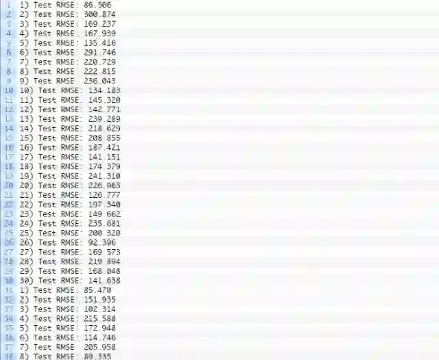 这意味着每个方案将创建并评测30个模型。从每次试验收集的均方根误差(RMSE)给出结果分布,然后可使用描述统计学(如平均偏差和标准偏差)方法进行总结。