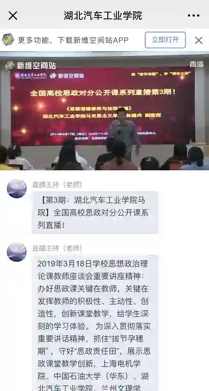 本系列教学直播源于上海电机学院、中国石油大学(华东)、湖北汽车工业学院、兰州文理学院、天水师范学院等高校马克思主义学院联合“对分课堂”创始人、复旦大学社会发展与公共政策学院张学新教授,以“室联网”新维空间站和MOOC公号为平台,在全国范围首推基于对分课堂新型教学模式、真实课堂情境下的思政课系列直播活动。