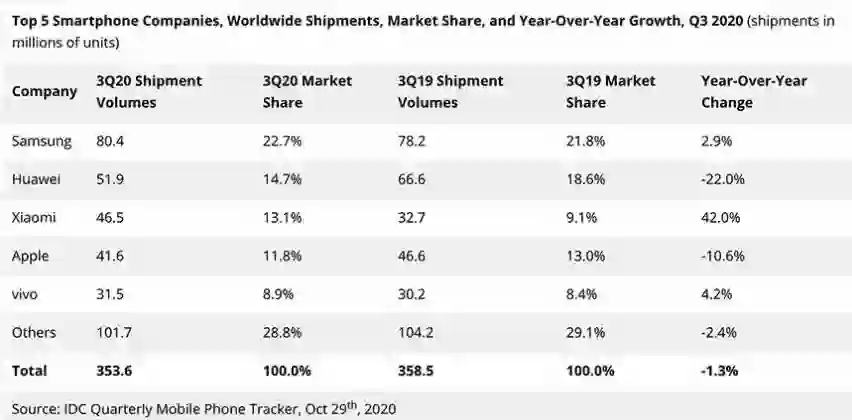 IDC数据显示,苹果第三季度全球出货量同比下滑10.6%,市场份额跌至11.8%。华为出货量则跌去了22%。