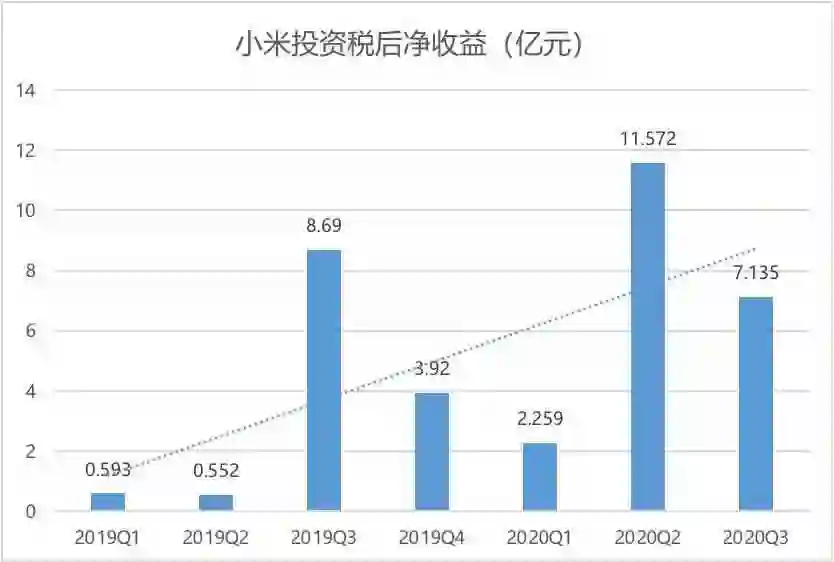 2020年第三季度,小米自处置投资录得税后净收益人民币达7.135亿元,作为对比,小米这季度的净利润为41亿元。