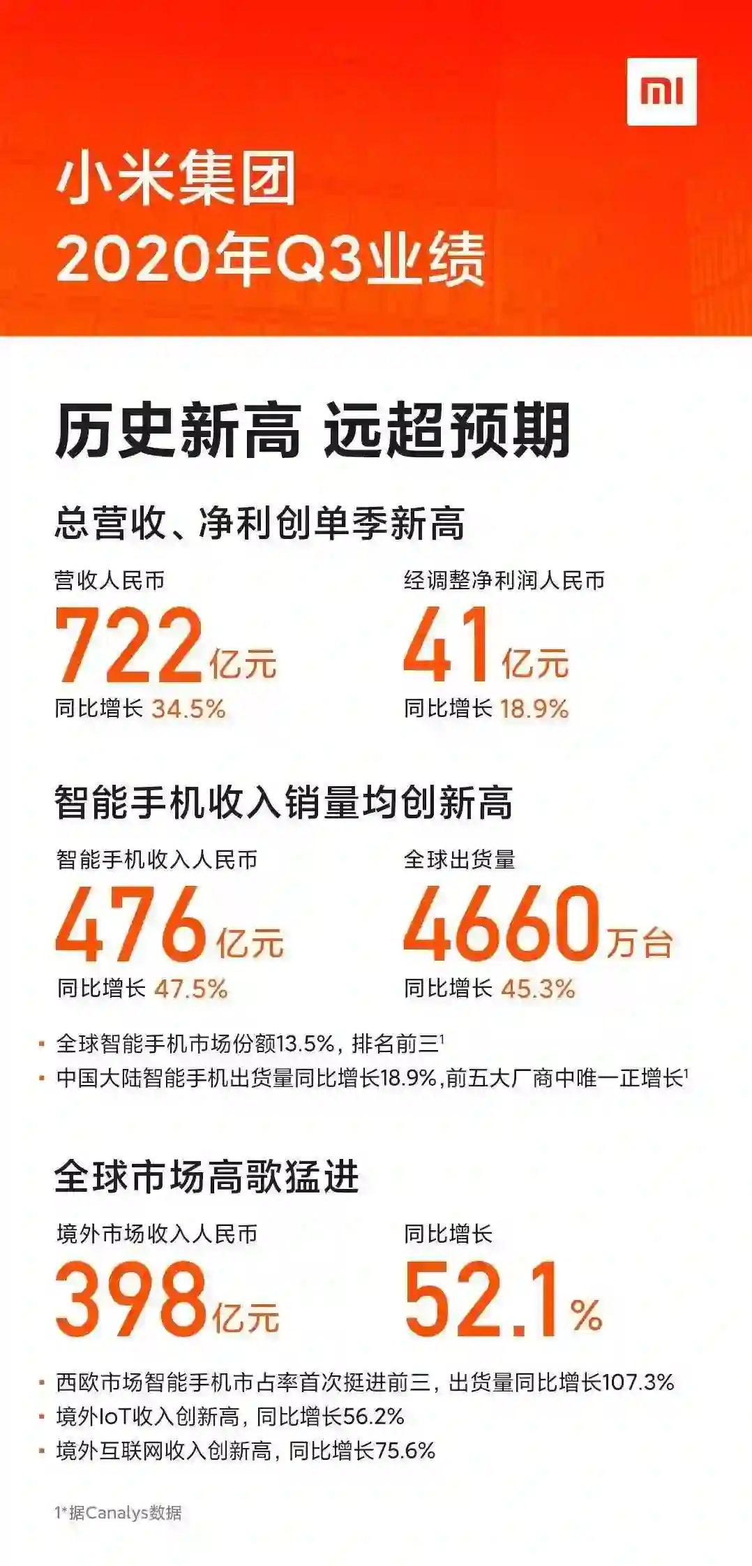 昨天下午,小米发布了2020年第三季度财报。这可能是自上市以来,小米单季度最漂亮的一次业绩答卷。