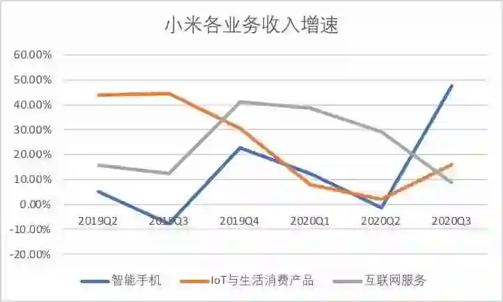 其中IoT与生活消费产品收入增速在本季度前已经连续下降了三个季度。受疫情影响,小米该业务前两个季度中的增长一度跌入个位。第三季度业务增长速度回归10%以上,但相较疫情开始前的速度,仍然相去甚远。