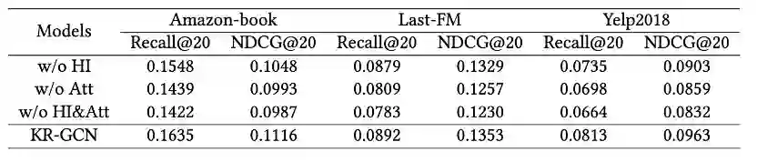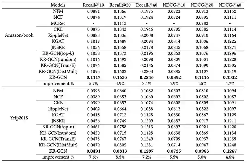 本文在Amazon-book,Yelp2018和Last-FM三个数据集上进行实验,KR-GCN 在三个数据集上的性能都优于基线模型,性能比较结果验证了 KR-GCN 的有效性。