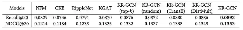 与基线模型中的最佳性能结果(即Amazon-book中的JNSKR、Yelp2018和Last-FM 中的 KGAT)相比,KR-GCN的Recall@20分别提高了 4.9%,8.5% 和 2.5%,NDCG@20分别提高了4.4%,5.0% 和 2.1%。我们将所提KR-GCN 优越的推荐性能归因于利用图结构信息和语义信息,并选择了更有助于预测用户偏好的推理路径。