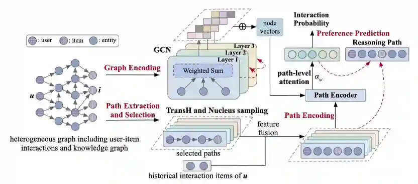 本文提出了KR-GCN用于可解释性推荐,文章将用户物品交互数据和知识图谱集成到异构图中,并使用图卷积网络对异构图进行编码,为了解决图中的错误传播问题,文章设计了一种基于特征转换的方法对用户物品对之间的多跳路径内的三元组进行打分,并利用核采样自适应地选择三元组。为了提供可解释性,文章引入了路径级的自注意力机制来区分不同选择路径的贡献并预测交互概率,同时提供权重最高的路径作为推荐的解释。