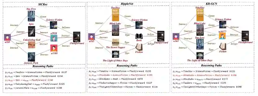 我们从Amazon-book中选择了一个示例来展示KR-GCN的可解释性,可以发现,与对比模型相比,KR-GCN 在用户和物品之间提供了更多类型的关系。