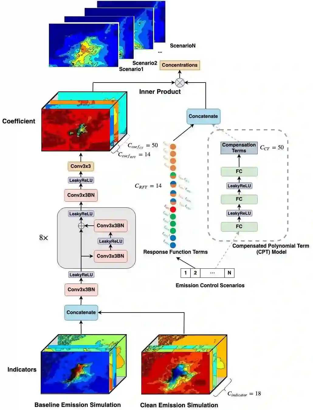 在 E4 中,我们仍然保留 CTM 数值模型对未减排场景 E_(p_0) 的模拟,并且使用深度学习模型来刻画关系函数 R(⋅)。因为 R(⋅) 中不涉及任何复杂的化学反应过程,而只关心响应曲面上各个点之间的关系,因此深度学习模型可以得到非常低的近似误差。