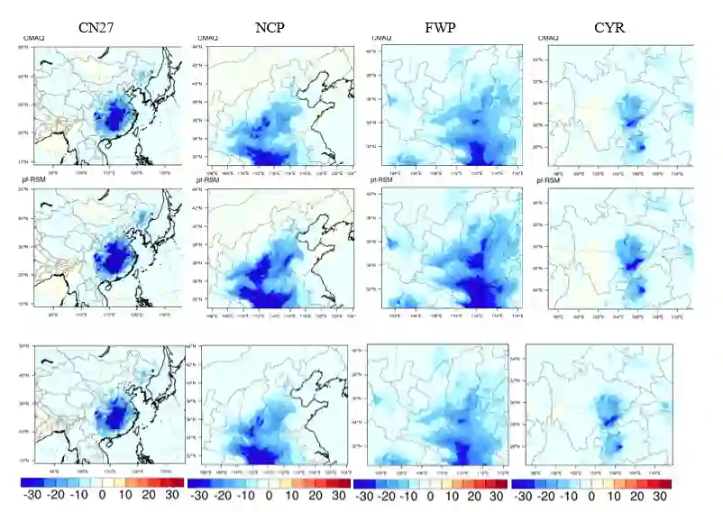 研究人员使用了四个不同尺度和区域的空气质量响应曲面数据进行验证,包括中国全境、华北平原、汾渭平原以及川渝平原。在四个数据集上,DeepRSM 对响应曲面的拟合准确度都取得了显著优于前人方法的效果,并且对所需采样次数和数值模拟成本均减少90%以上。