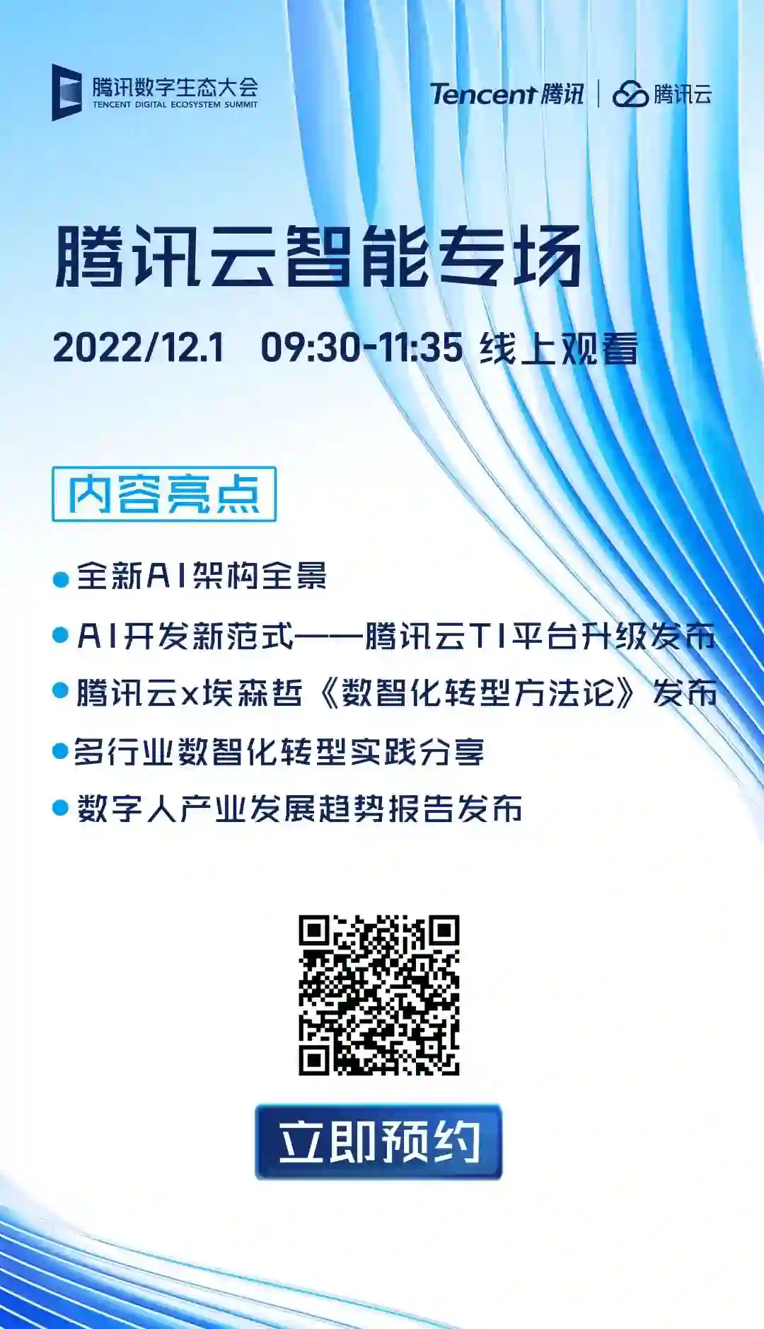 数实融合的时代背景下,数智化转型是新一轮科技革命和产业变革的战略选择,也是企业提质增效、抢占发展制高点的关键之举。去年,腾讯产业互联网进行战略升级,确立 “扎根行业,深耕区域、提升效率” 的全新战略。过去一年多时间,作为产业数字化助手的腾讯深入实体产业并发挥积极作用,不仅在原有基础上不断拓宽行业广度,区域宽度,在产业纵深和细分行业也取得新的突破,将自身技术优势、产品优势和生态优势与行业、产业认知相结合,助力实体产业在各自的赛道上加速发展。 12 月 1 日,腾讯云智能将结合与各个行业伙伴共同打磨的案例实践与技术积累,联合埃森哲共同发布一份产业数智化转型方法论白皮书。这份白皮书将为腾讯云智能未来推进数实经济业务起到重要的指导作用,也为国内产业数智化提供参考价值。 看点三:腾讯云 TI 平台再次上新,为企业提供更加丰富的平台化服务