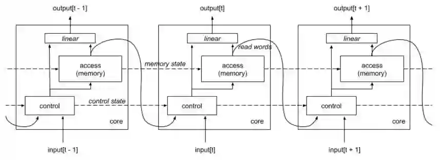 可微神经计算机是一种循环神经网络。在每一个时间步中,它的状态由当前记忆内容和诸如记忆使用的辅助信息组成,并将在时间 t 的输入映射到时间 t 的输出。该架构能作为 RNNCore 模块的集合而实现,RNNCore 允许将不同的模块嵌入到一起以试验架构上的变体。