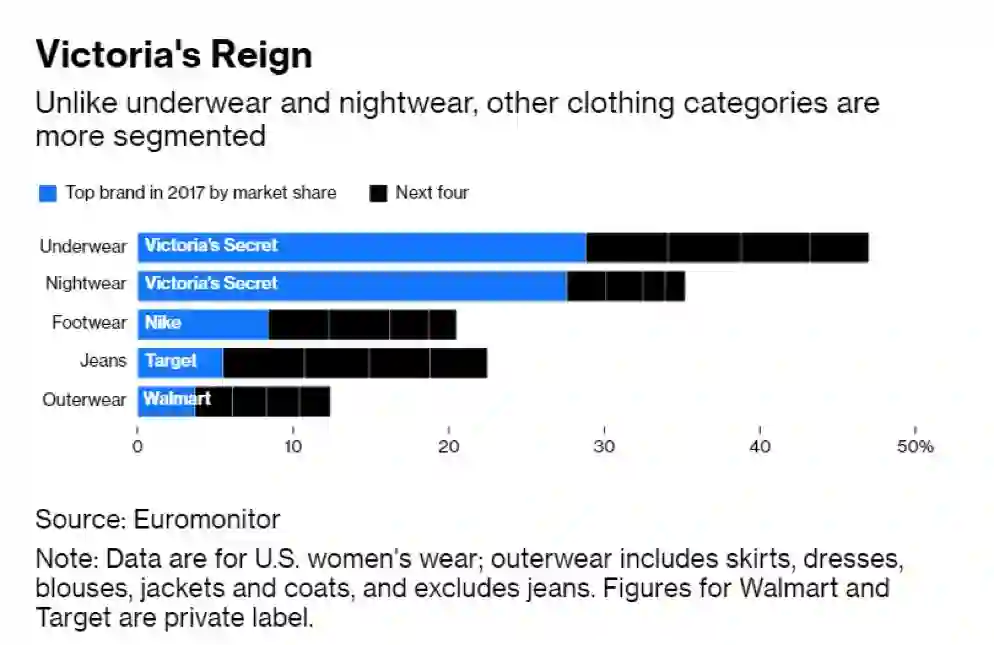 但是内衣行业的景象截然不同。维多利亚的秘密在美国市场占据巨大的份额,在内衣类(包括文胸和内裤)和睡衣类(包括睡衣套装和真丝衬衫)都是行业老大。