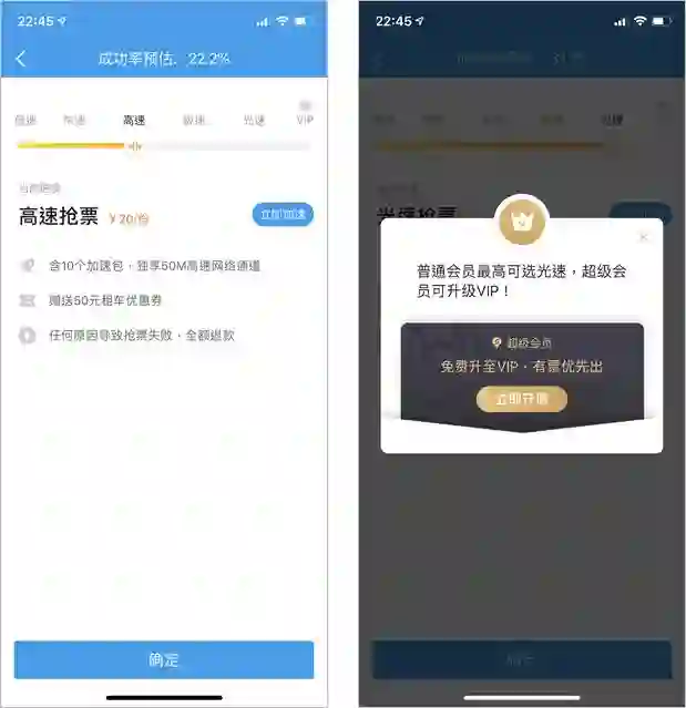 从不花钱的低速,到中速、高速、极速、光速、VIP,6 种抢票速度对应 6 种成功率,越快当然抢到的几率也就更高。