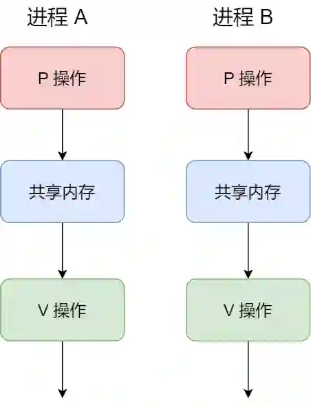 进程 A 在访问共享内存前,先执行了 P 操作,由于信号量的初始值为 1,故在进程 A 执行 P 操作后信号量变为 0,表示共享资源可用,于是进程 A 就可以访问共享内存。