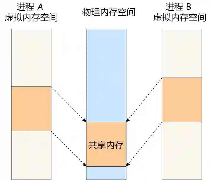共享内存的机制,就是拿出一块虚拟地址空间来,映射到相同的物理内存中。这样这个进程写入的东西,另外一个进程马上就能看到了,都不需要拷贝来拷贝去,传来传去,大大提高了进程间通信的速度。
