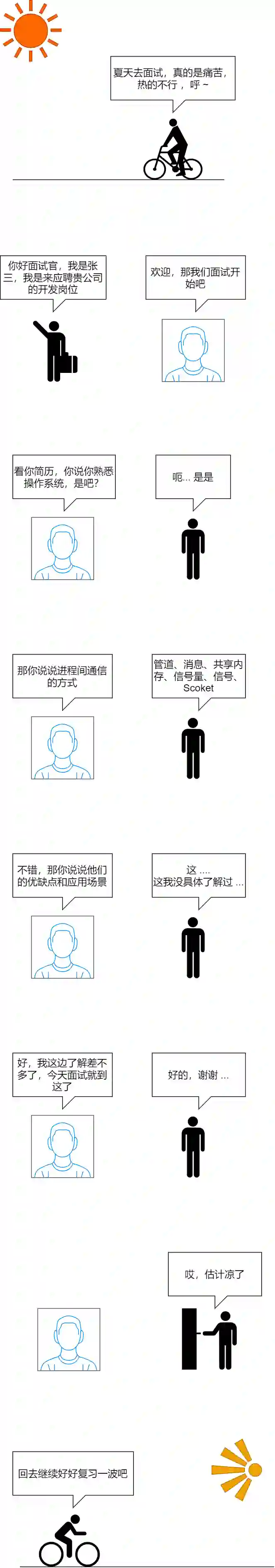 很明显,在这一场面试中, 张三在进程间通信这一块没复习好,虽然列出了进程间通信的方式,但这只是表面功夫,应该需要进一步了解每种通信方式的优缺点及应用场景。