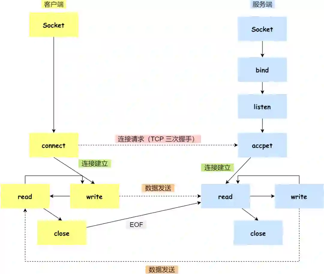 客户端调用 write 写入数据;服务端调用 read 读取数据;