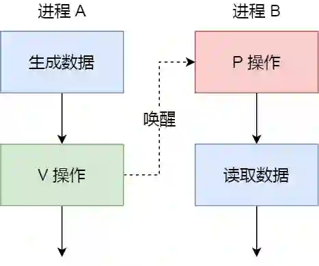 接着,当进程 A 生产完数据后,执行了 V 操作,就会使得信号量变为 0,于是就会唤醒阻塞在 P 操作的进程 B;