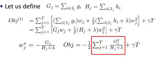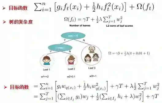那么树的复杂度式子:右边第一项是叶子结点的数量T,第二项是树的叶子结点权重w的l2正则化,正则化是为了防止叶子结点过多