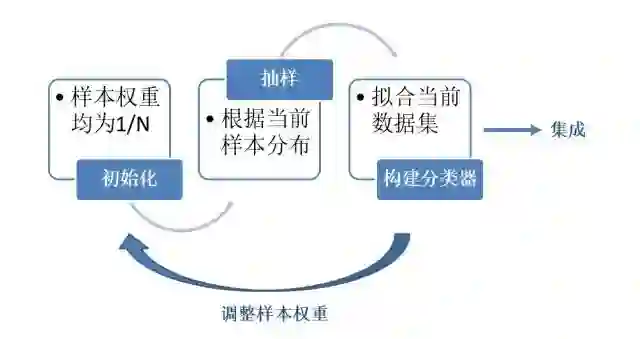 boosting的每一次抽样的样本分布都是不一样的。每一次迭代,都根据上一次迭代的结果,增加被错误分类的样本的权重,使得模型能在之后的迭代中更加注意到难以分类的样本,这是一个不断学习的过程,也是一个不断提升的过程,这也就是boosting思想的本质所在。迭代之后,将每次迭代的基分类器进行集成。那么如何进行样本权重的调整和分类器的集成是我们需要考虑的关键问题。