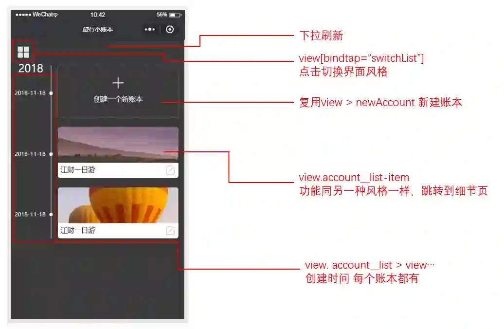 账本页有两种显示的风格,左上角的按钮可以来回切换风格,下拉可刷新页面,显示accounts数据表中存储的账本信息。显示时有个小细节,需要根据创建的时间先后来显示,越晚创建的越先显示: