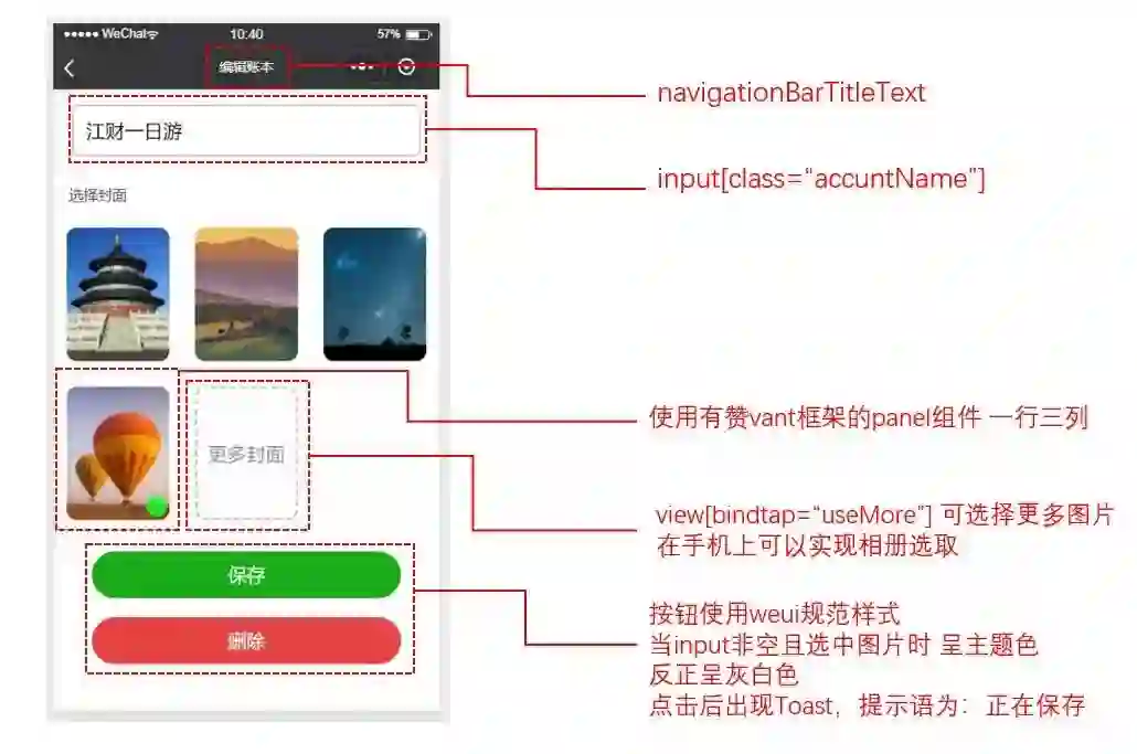 账本页通过调用相应的云数据库API,可进行一系列的增删改操作。值得一提的是,修改时需要表单回显,删除时需要级联删除。因为一个账本中有许多收支情况,spenditems表就是进行收支记录,所以删除账本时需要级联删除对应的spenditems表中的收支信息。