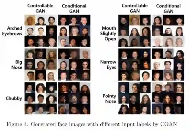 CGAN还具有另一优势:相较于条件GAN,CGAN可以生成label-focused样本。通过选择γ的低值,可以讲发生器更多的专注于输入标签。图4是CGAN,γ=5和条件GAN的对比。从图中可以看出CGAN生成的人脸图片比条件GAN更契合输入标签。例如,使用“Arched Eyebrow”标签时,CGAN生成的图片全部符合这个标签的特征,而条件GAN则有偏差。