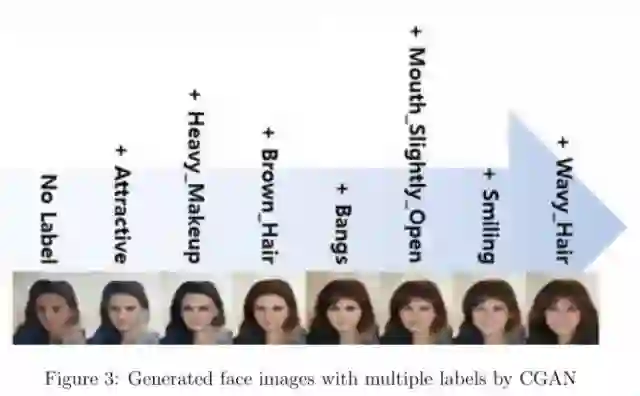 通过想发生器输入多个标签,CGAN可以生成多标签样本。CelebA数据库由多个标签的图片构成。例如,一个样本图片可以有“Attractive”,“Blond Hair”,“Mouth Slightly Open”和“Smiling”的标签。