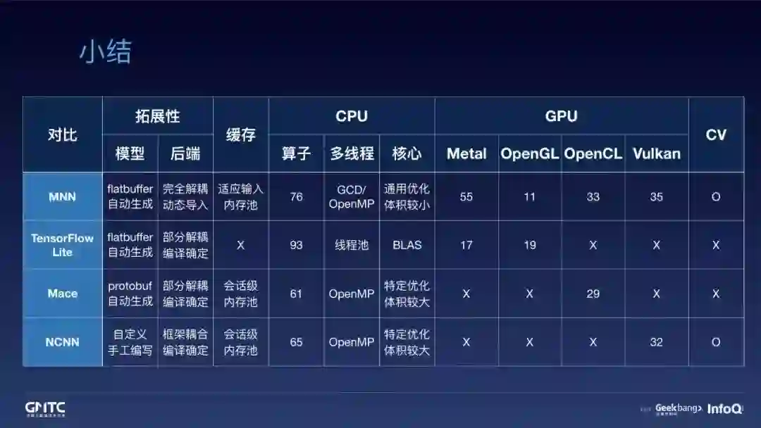 总的来说,MNN 吸纳了前人的经验,也结合自己对端侧推理引擎的认知,做了许多创新。综合考虑性能、模型和后端的拓展性、缓存、CPU 和 GPU 的算子实现,以及 CV 库等方面的表现,在端侧推理引擎中,MNN 是值得移动 AI 用户尝试的选择。