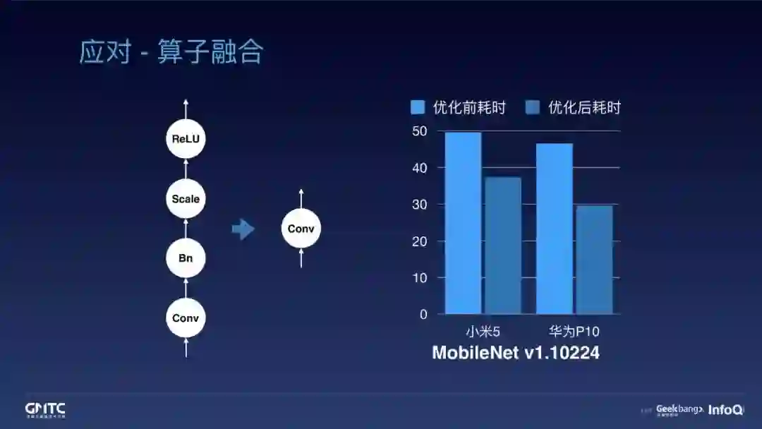 这样,四个算子就可以合并成一个算子。融合的过程避免了三次 tensor 读写、两次 tensor 乘加。优化效果见右图,MobileNet V1 在小米 5 和华为 P10 上有 20 ~ 40% 的性能提升,效果还是比较明显的。