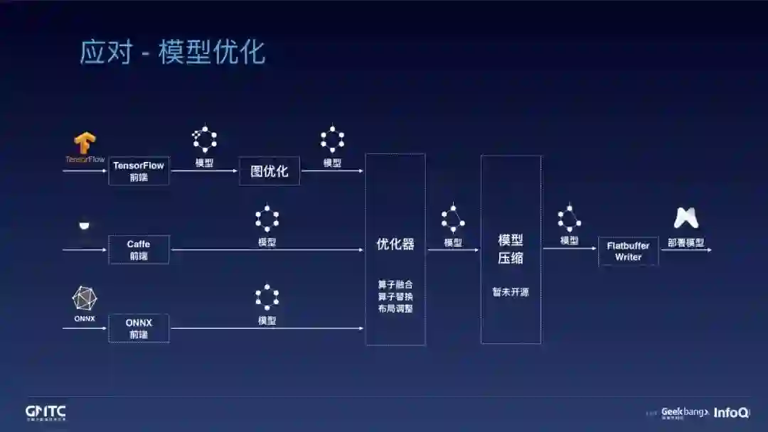 在模型优化中,MNN 引入了前端的概念来统一训练框架。不同的前端负责加载不同训练框架的模型,统一转换为 MNN 的模型格式。对于最常用的训练框架 TensorFlow 和 Caffe,我们提供了独立的前端;其他训练框架,比如 MXNet,则需要先将模型转换为 ONNX,再通过 ONNX 前端加载。这里,由于 TensorFlow 的算子颗粒度相比 Caffe 和 ONNX 要更小,我们引入了图优化的模块来对齐算子之间的颗粒度。模型转换之后,会经过优化器优化,包含算子融合、算子替换、布局调整等等。之后,可以选择对浮点模型执行量化压缩。目前模型压缩的模块还没有开源,我们会在完善之后,将相关代码开源。这些步骤都完成之后,会使用 flatbuffer 来保存部署模型。