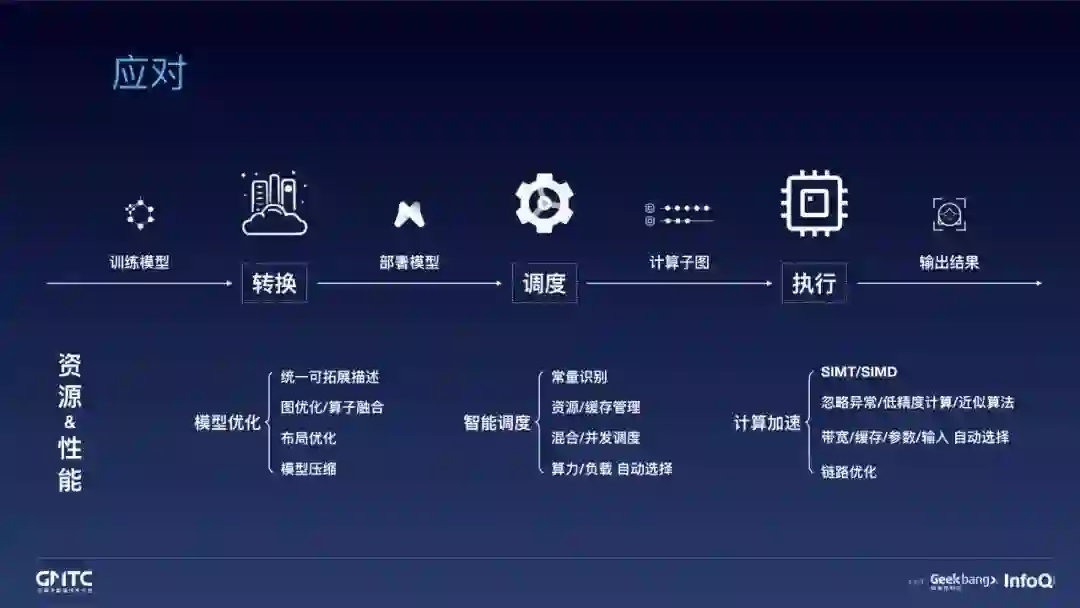 一款优秀的端侧推理引擎,就需要在这样碎片化的环境下,利用设备有限的资源,尽可能发挥出设备的性能。为此,也需要在转换、调度、执行上加入相应的优化策略。下文,会就其中的部分展开说明。