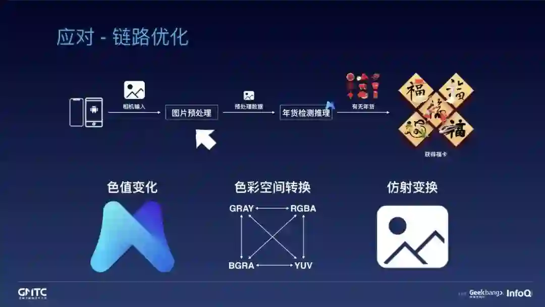 链路优化可以举一个 19 年春节淘宝扫年货的例子。在获得手机相机输入后,每一帧的图像首先需要经过一次预处理,将图片缩放到年货检测模型的输入大小上,然而再经过推理,判定图像有没有年货,如果有,就发放相关权益。这个过程中,图片预处理的耗时也不容忽视。降低这个耗时,就可以帮助我们提升帧率,从而改进用户体验。为此,我们引入了一个轻量级的 2D 图片处理库,可以高效地完成色值变化、色彩空间的转换或者仿射变换等。这样,MNN 的用户就不再需要为图片处理引入 libyuv 或者 opencv 了。