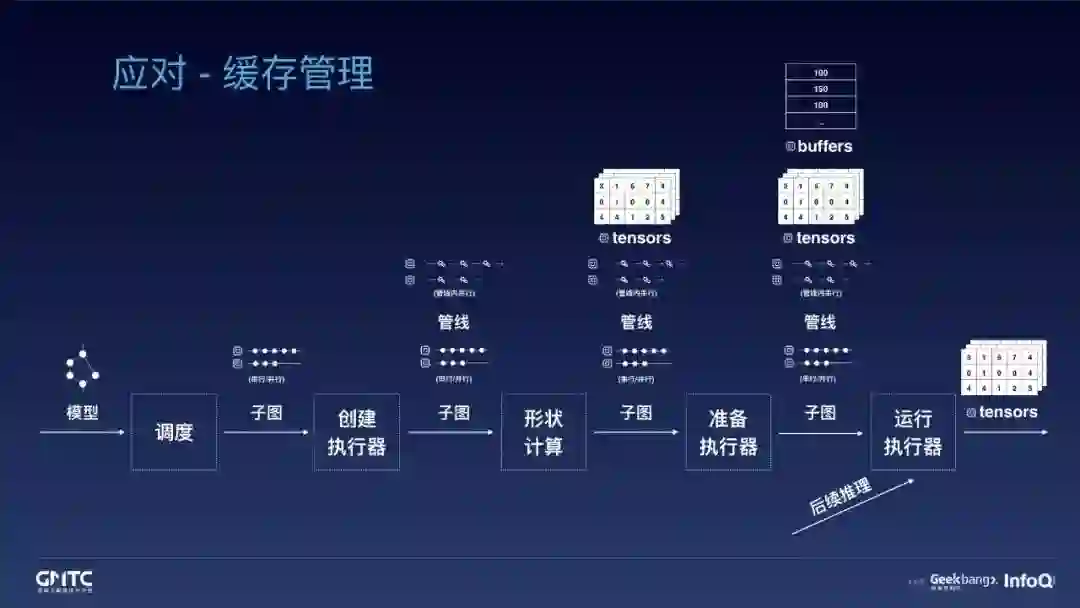 在创建完执行器之后,子图和管线已经就绪。下来,需要计算出所有 tensor 的形状,在相应的后端上完成内存的分配。而后,在准备执行器时,再为所有的执行器预先在后端上申请好必要的 buffer。运行结束后,返回 tensor 即可。