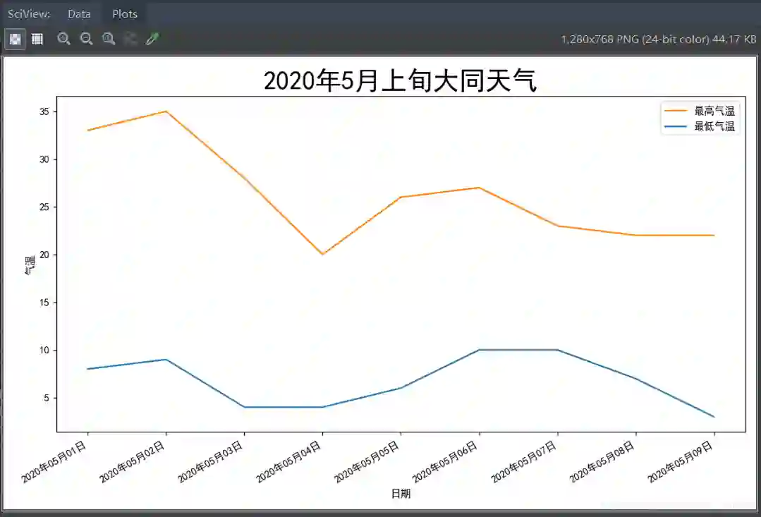 plt.title('2020年5月上旬大同天气',fontsize=25) # 字体大小设置为25