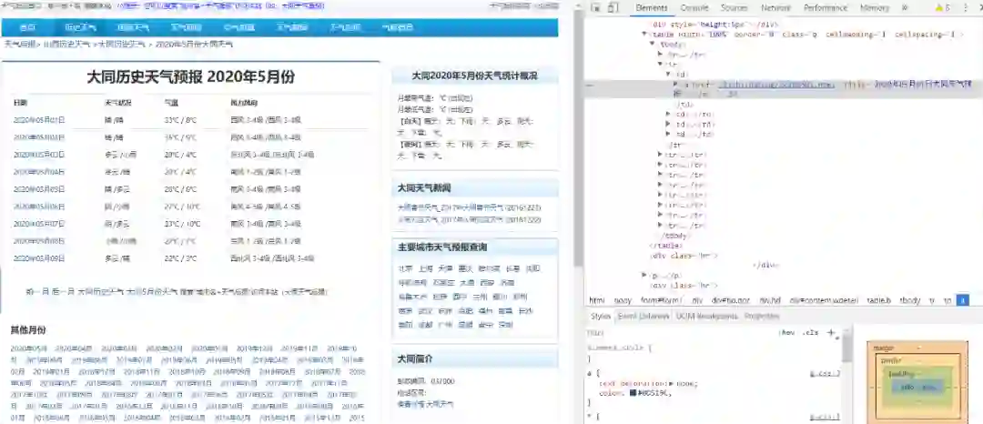 # 爬取目标网页(大同市2020年5月份天气[网站:天气后报])