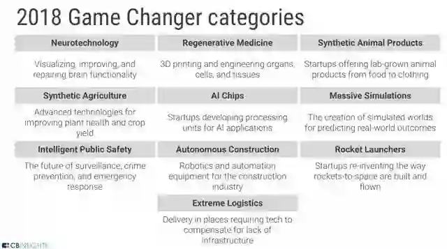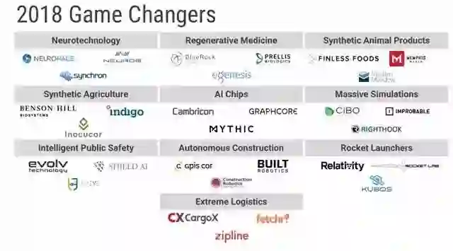 其中,神经技术领域的主要变化来自大脑的可视化、强化和修复,再生医学领域的主要变化来自3D打印的器官、细胞和组织,合成动物产品领域的主要变化是创企将合成动物带到食品和服装市场,合成农业领域的主要变化体现在先进技术带来的作物健康优化和产量提供,AI芯片领域的主要变化来自于创企发布的AI处理单元和基于此的相关应用,大型模拟领域的变化则是模拟计算终于走进现实预测可能的未来,智慧公共安全领域的主要变化来自智能监控、犯罪预防和紧急响应,自主建构领域的主要变化来自机器人技术和自动化装配,火箭发射领域的主要变化是创企提出的构建和回收方案,极端物流的主要变化即在缺乏基建的地区构建物流赔偿方案。