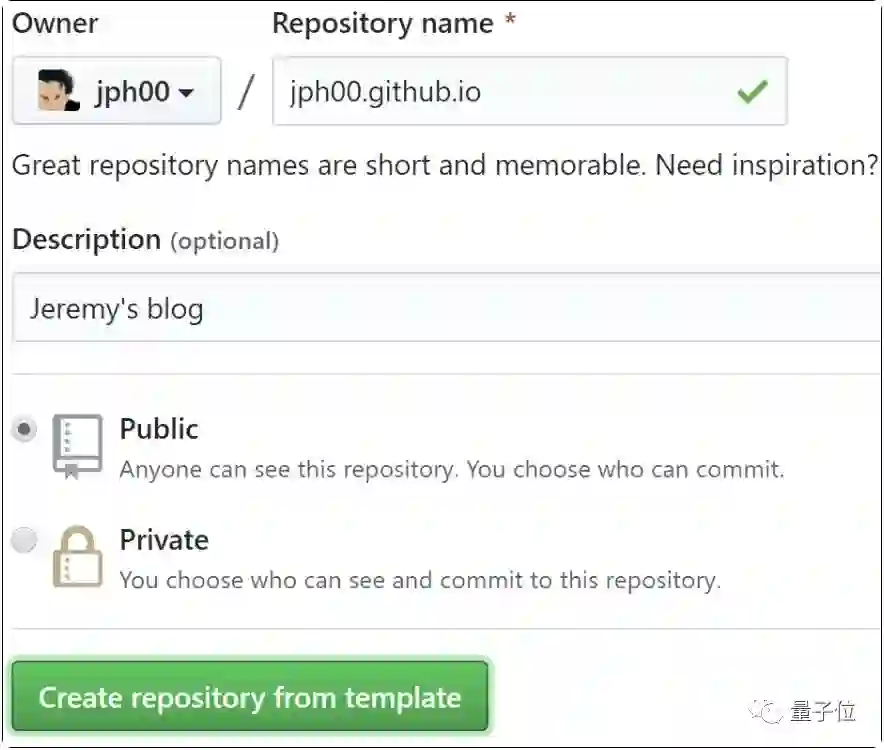 注册一个存储库(repository),就是存储博客的地方。注册名字的格式是:github上的名字+github.io;储存库的性质选择公共Public。