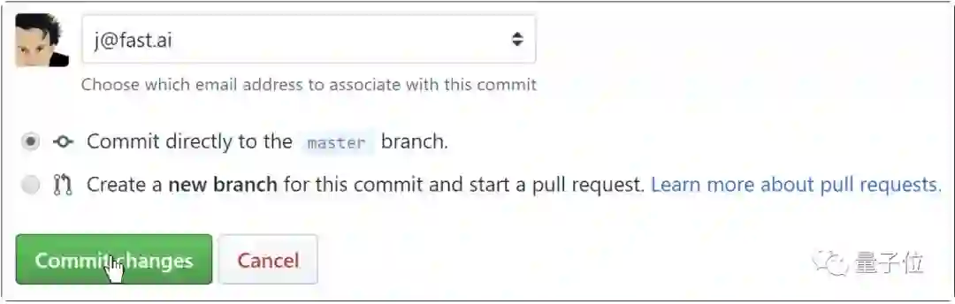 滚动到底部并单击Commit changes绿色按钮来提交。在GitHub上,“提交”意味着将其保存到GitHub服务器。