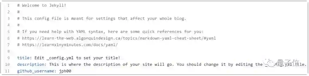 还可以对博客进行其它设置,单击名为_config.yml 的文件,然后像之前一样单击编辑按钮,在冒号后面输入相应的内容,可以更改标题,描述和GitHub用户名值。输入的内容就会在主页显示。