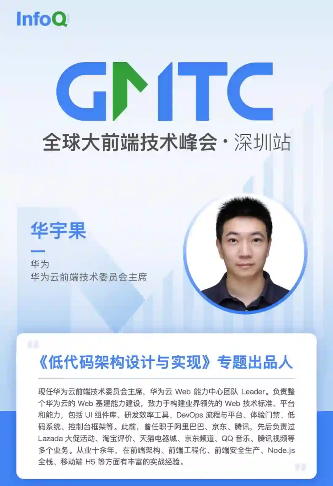 为给大家提供更多的借鉴和思考,12 月 5-6 日,GMTC 全球大前端技术大会(深圳站)2021 策划【低代码架构设计与实现】专题,邀请了华为云前端技术委员会主席华宇果担任出品人,并亲临现场,与大家一起聚焦底层低代码核心架构实现,如组件加载与嵌套机制、页面容器渲染、实时预览、插件化架构、跨端生成、自然布局、高低代码混合开发等内容,干货满满。