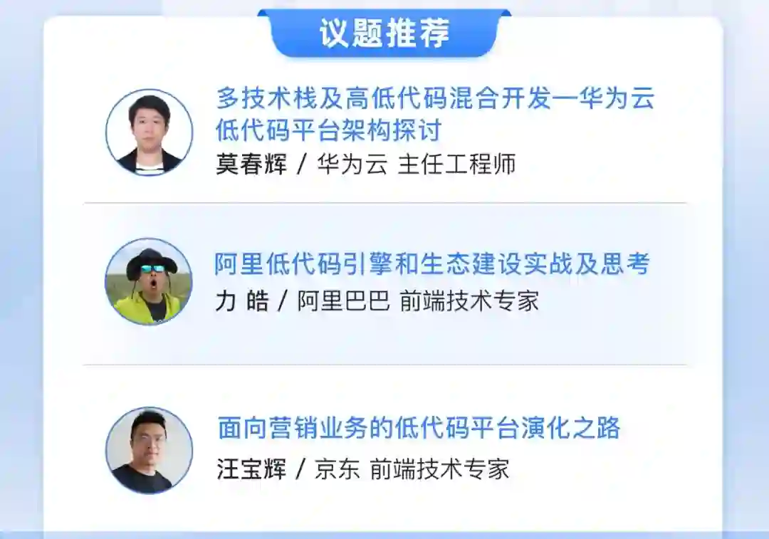在层层打磨和筛选后,我们确定邀请了华为云主任工程师莫春辉老师、阿里巴巴前端技术专家力皓老师,以及京东前端技术专家汪宝辉老师,与大家一起从多技术栈及高低代码混合开发、低代码引擎、面向营销业务的低代码平台三个不同方面探索低代码架构的设计与实现。